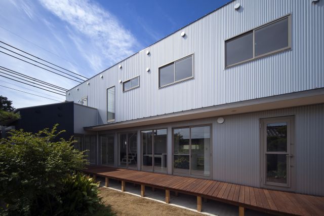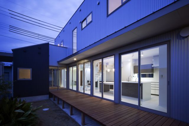 7.7間の長いデッキを内外に連結させて、平屋の玄関棟と二階建てのリビング棟を繋げています。リビングは、中庭をはさんで母屋と繋がっています。外壁は