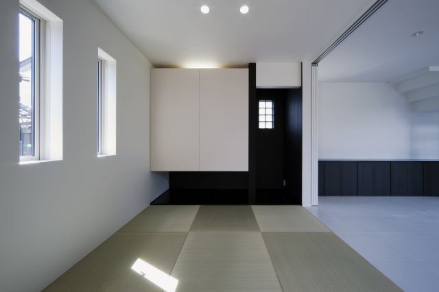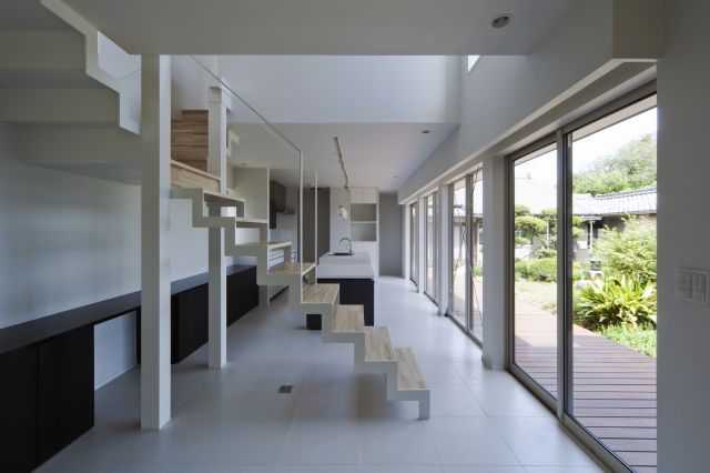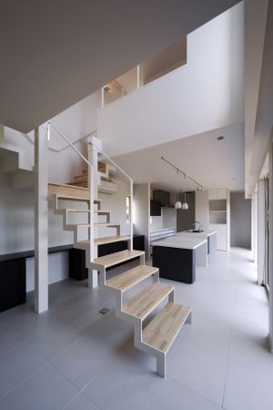 ノトーンでデザインされた和室、白を基調にしたモダンな空間のリビングとダイニングは、軽やかなT型階段で緩やかに分かれています。ステップを登れば、佐