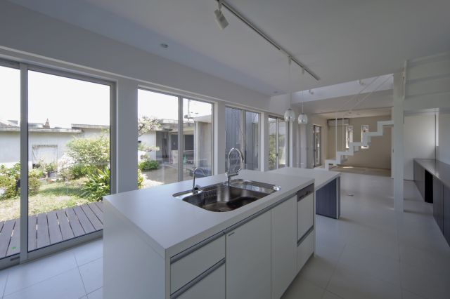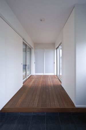 庭に取り込み、リビング棟で、西日をコントロールしています。玄関には、シューズクローク内に家族玄関を併設し、デッキを渡ってリビングに繋がります。モ