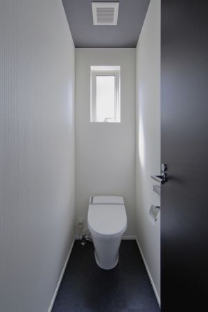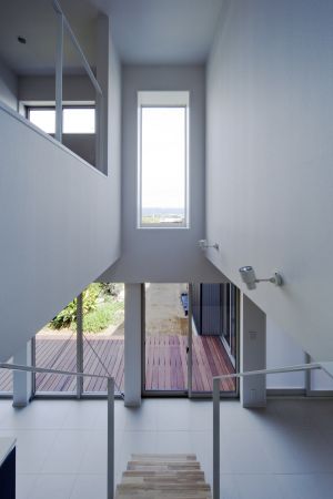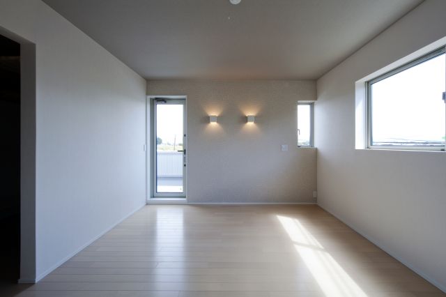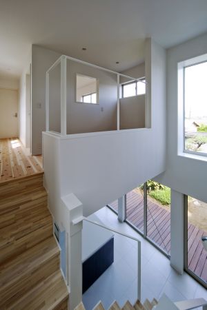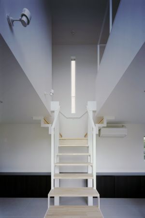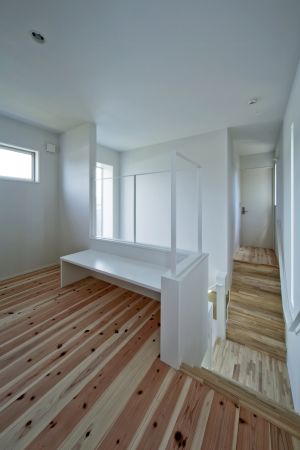 保川の緑が望め、西側スリット窓は、日時計として楽しめます。踊り場から、モダンな主寝室と、杉の床板の書斎コーナー・子供室へ、それぞれアプローチしま