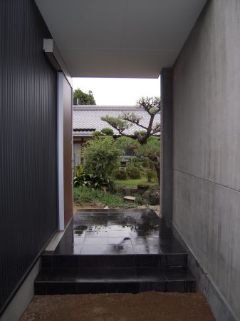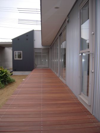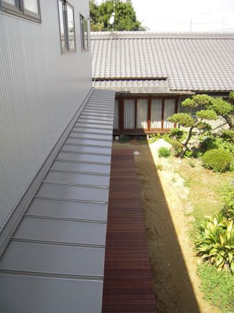 二色使いとし、外側は、ブラック色で母屋と一体感をもたせ、デッキに面した内側は、シルバー色でデッキと中庭を明るい雰囲に構成。玄関棟で、南の太陽を中