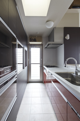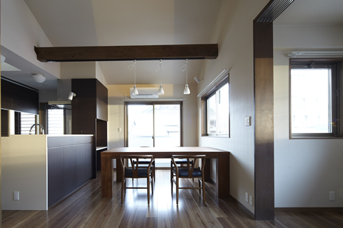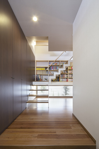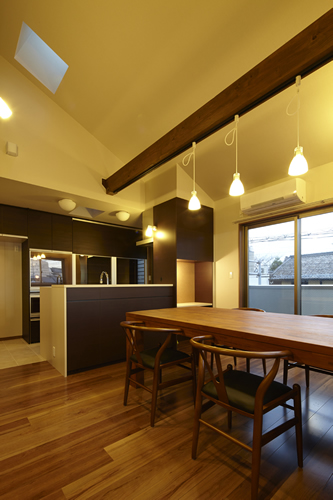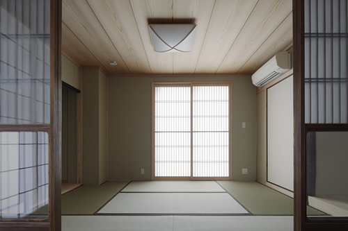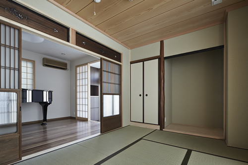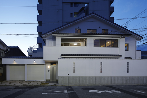 「西本願寺/歴史遺産型美観地区」での建替え。景観や耐火建築物など、規制の厳しい条件がありました。従来のRC造の問題点を解消する為、「外断熱工法」を取り入れました。サッシには、エコガラス(高断熱Low-E膜付)を選択し、夏・涼しく、冬・暖かい構造としました。ピアノ室は、防音/壁と扉を使用しています。階段収納をデザインし、将来の二世帯空間にも考慮して、計画しています。 出来る限り、既存の建具や敷石などを再利用し、顧客の「思い出を大切にされる心」が、詰まっています。