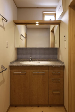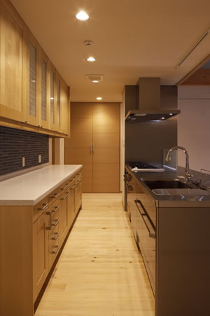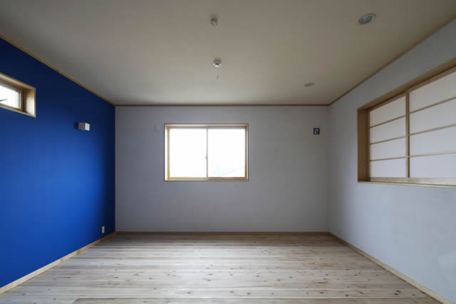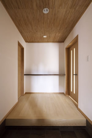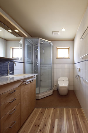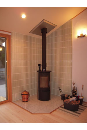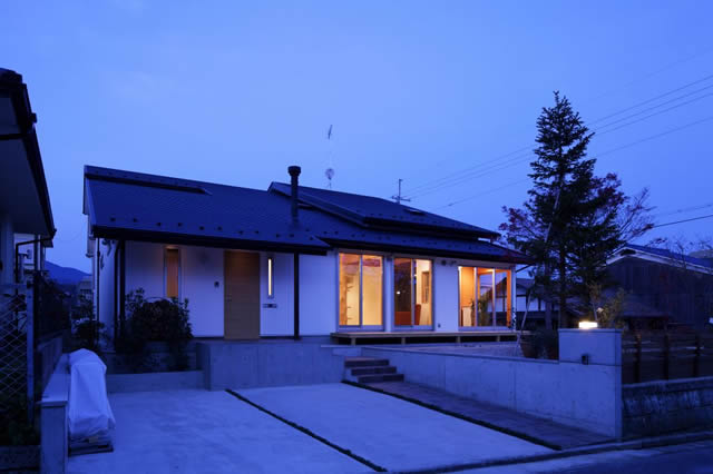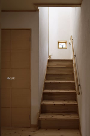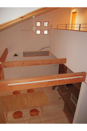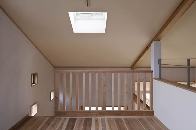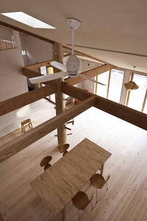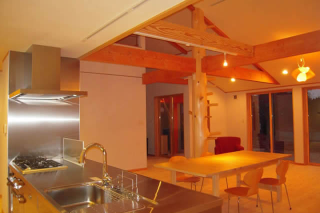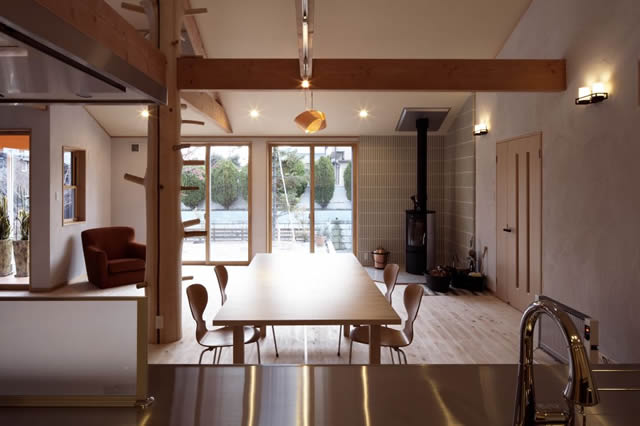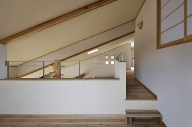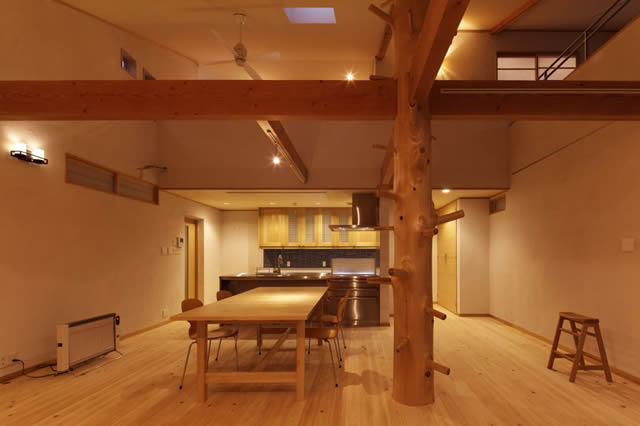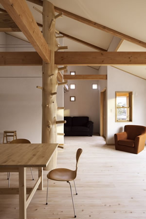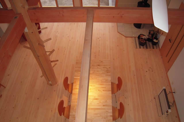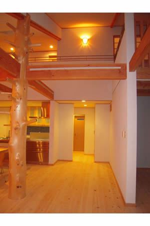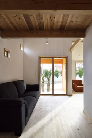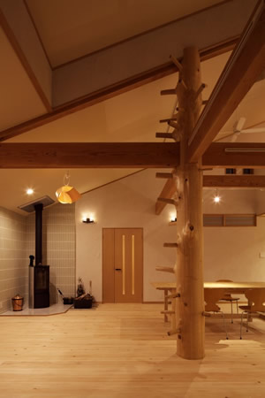 景観と薪ストーブの空気循環を考慮した為、2階の棟から軒先まで広がる、南向きの大きな勾配屋根を「吹抜け」としました。リビング中央にそびえる枝付大黒柱と、梁の構造を表現する事で、心地よい大空間が生れました。自然素材にこだわり、ムクの檜、火山噴出物のシラス、漆喰等で構成されたLDK〜みんなの書斎〜サンルームを連続させ、2Fエリアまで見渡せる三角形の空間では、ご家族の息づかいを感じ、風と光を取り込んだ柔らかで優しい、ゆっくり時を刻む住まいとなりました。豊かな空間維持の為、1F・2Fに集中クローゼットを計画。特に、1Fでは、アウトドア用と内部用の収納を、玄関土間エリアに集中させ、機能性をプラスしています。広々した駐車スペースに続くアプローチとリビングデッキから、開放感を演出。
