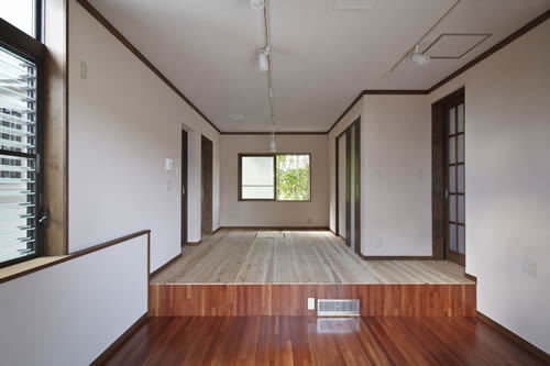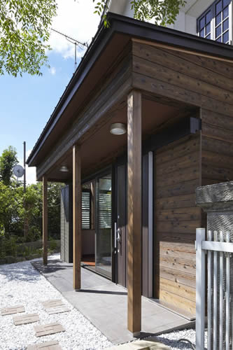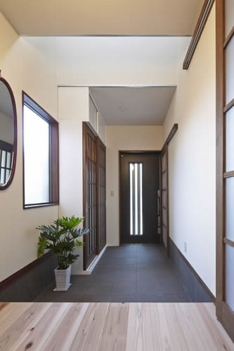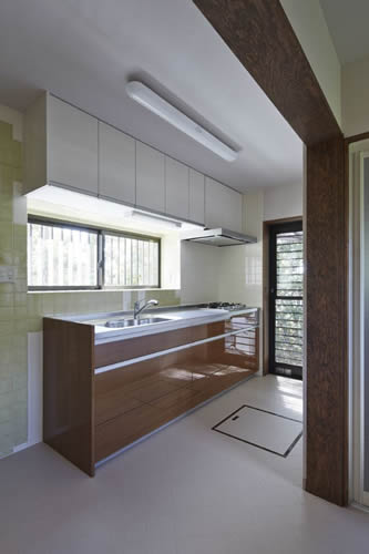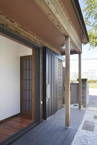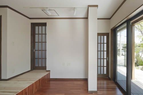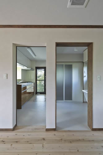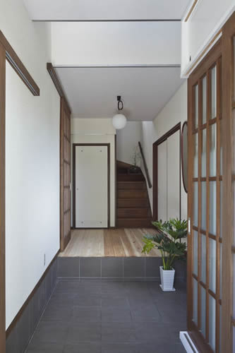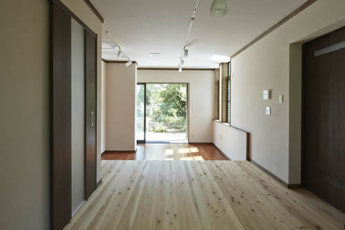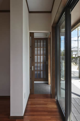 これからは、自宅でゆっくり過ごされる時間が多くなり、親しい友人とのホームパーティも開かれる事から、玄関〜リビングを増築し、テラス一体型としました。同レベルのテラスと内デッキ、床上げした杉フローリングと、二つの顔を持つリビングは、テラスからの十分な採光と風を運び、キッチンと増築したユーティリティに繋げています。将来に向けて、多目的な空間利用を考慮しました。お気に入りのリビングドアは、他の引戸とデザインを統一させ、玄関収納に再利用。